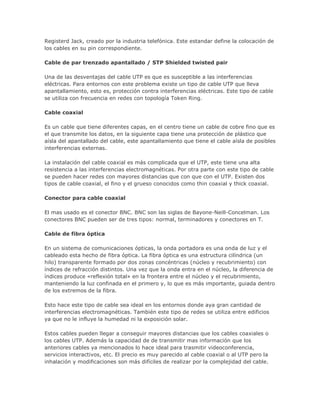 Este documento describe los diferentes tipos de cables utilizados para conectar dispositivos en una red, incluyendo cable de par trenzado sin apantallar (UTP), cable de par trenzado apantallado (STP), cable coaxial y cable de fibra óptica. También menciona redes inalámbricas y especifica los conectores y colores estándar para cada tipo de cable.