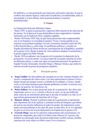 La Generación del 27 estaba compuesta por poetas que publicaron en los años 1920 y renovó la poesía española fusionando la tradición literaria con las vanguardias. Los poetas más destacados fueron Federico García Lorca, Pedro Salinas, Rafael Alberti, Luis Cernuda y Vicente Aleixandre. Cultivaron temas como el amor, la naturaleza y la sociedad desde diferentes estilos que iban de lo popular a lo intelectual.