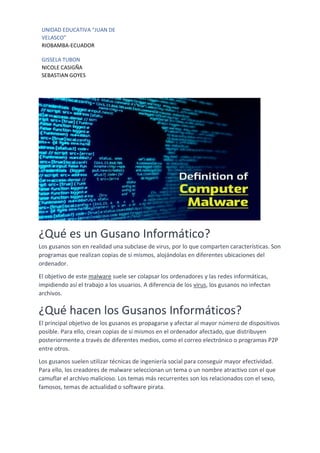 El documento habla sobre malware. Explica que el malware incluye programas maliciosos como virus, gusanos y troyanos que pueden dañar dispositivos. Describe que los virus y gusanos se replican a sí mismos mientras que los troyanos se disfrazan de software legítimo para acceder a sistemas. Recomienda instalar software antivirus para protegerse de estas amenazas.