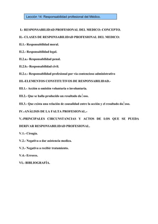 I. El documento discute la responsabilidad profesional del médico, dividiéndola en moral y legal. La responsabilidad legal incluye la penal, civil y administrativa.