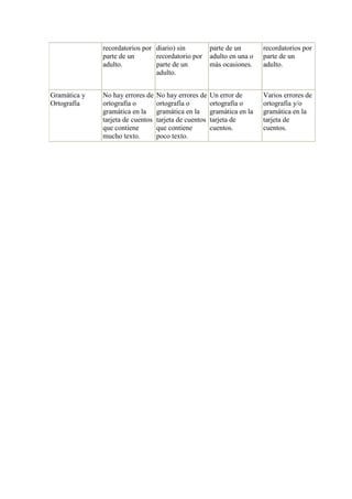 Este documento presenta una rúbrica para evaluar tarjetas de cuentos creadas por estudiantes. La rúbrica evalúa el contenido, la claridad y el orden, los elementos requeridos, el uso del tiempo y la gramática/ortografía. Los estudiantes reciben puntuaciones de 1 a 4 en cada categoría, con 4 siendo la mejor calificación.