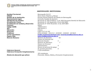 Este documento presenta el informe de autoevaluación de desempeño institucional (ADI) realizado por la Escuela Normal Superior del Distrito de Barranquilla para el año 2010. El resumen describe los propósitos de la ADI, que incluyen valorar la acción educativa de la institución, fortalecer los procesos de participación y autonomía, y proponer estrategias de mejoramiento. También explica que la ADI se justifica como un proceso ético y reflexivo para comprender y mejorar la práctica pedagógica a la