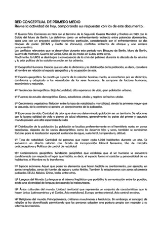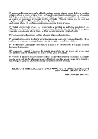 Este documento presenta un resumen de conceptos clave relacionados con la geografía humana y la demografía. Explica brevemente 21 tópicos como la Guerra Fría, tendencias demográficas, tasas de natalidad y mortalidad, migraciones, tipos de ciudades y pirámides de población. El objetivo es servir como apoyo de estudio para los estudiantes, al mismo tiempo que enfatiza la importancia de repasar la materia vista en clases.