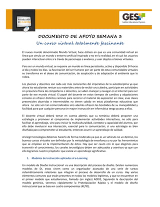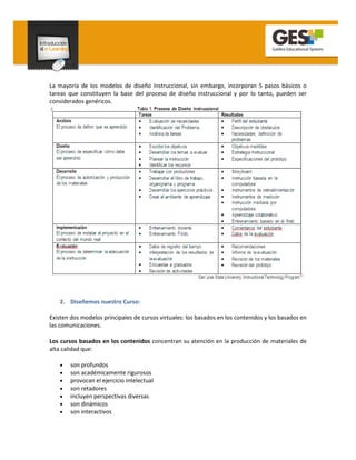 El documento describe los aspectos fundamentales de diseñar un curso virtual efectivo. Explica que se debe analizar a los estudiantes, los objetivos de aprendizaje, y los recursos disponibles. También cubre los modelos de instrucción, como el diseño basado en contenido o comunicación, y el ciclo de vida que incluye la planificación, producción, ejecución y evaluación. El diseño de contenido y su organización son elementos clave para lograr un aprendizaje significativo.
