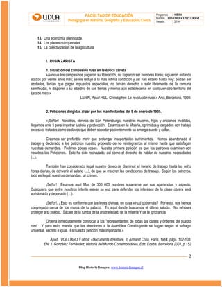 Este documento presenta información sobre la Revolución Rusa de 1905 y 1917. Incluye documentos históricos primarios relacionados con las revoluciones, como peticiones de trabajadores al zar en 1905 y un diario del zar Nicolás II describiendo el "Domingo Sangriento" de 1905 cuando tropas abrieron fuego contra manifestantes. También presenta procedimientos para analizar documentos históricos e identificar su autor, tema, fecha y tipo de fuente. Finalmente, lista 15 documentos específicos relacionados con la Revolución Rusa que