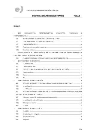 Este documento trata sobre los documentos administrativos, incluyendo su definición, funciones y características. Explica la clasificación de los documentos emitidos por la administración pública en documentos de decisión, transmisión, constancia y juicio. Además, describe la estructura general de cada tipo de documento administrativo.