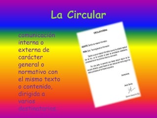 Este documento contiene información sobre diferentes tipos de comunicaciones escritas utilizadas en entidades y empresas, incluyendo circulares, memorandos, hojas de vida, correspondencia, cartas, actas y sobres. Define cada uno de estos documentos, explica sus partes y características, y clasifica los diferentes tipos dentro de cada categoría.