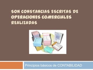 El documento explica que los documentos comerciales son constancias escritas de operaciones realizadas que son importantes para dejar constancia de las transacciones, identificar a las partes involucradas y respaldar las operaciones registradas. Los documentos deben ser solicitados, contabilizados y archivados de acuerdo a la ley por 10 años.