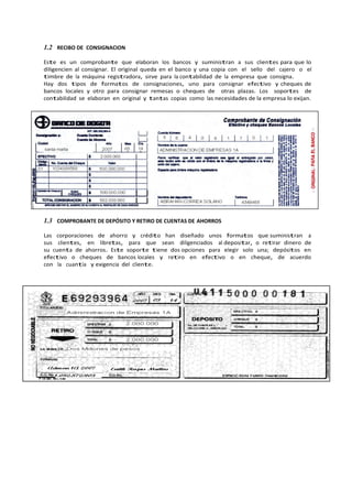 Este documento describe los principales soportes de contabilidad que se utilizan en una empresa, incluyendo recibos de caja, recibos de consignación, comprobantes de depósito y retiro, facturas de venta, comprobantes de venta con tarjeta de crédito, cheques, comprobantes de pago, letras de cambio, pagarés, notas de débito y notas de crédito. Explica los detalles clave de cada soporte y cómo se usan para registrar transacciones en la contabilidad de una empresa.