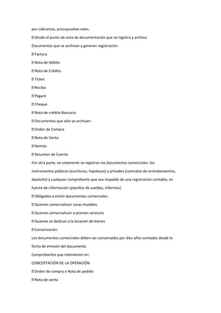 Los documentos comerciales son comprobantes escritos de las operaciones mercantiles que dejan constancia de las relaciones jurídicas entre las partes involucradas. Sirven para registrar contablemente las transacciones y controlar las operaciones de una empresa. Algunos documentos comerciales clave son los pedidos, facturas, remitos, cheques y notas de débito/crédito.