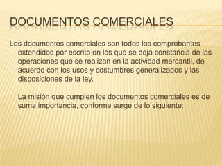 Este documento describe los diferentes tipos de documentos comerciales utilizados para registrar transacciones comerciales, incluyendo órdenes de compra, facturas, cheques y pagarés. Explica que estos documentos especifican los derechos y obligaciones de las partes involucradas, sirven como prueba legal de las transacciones y permiten el control y registro contable de las operaciones de una empresa.
