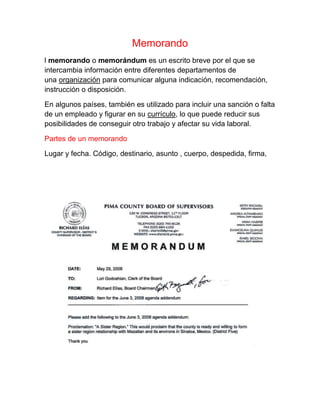 Este documento describe diferentes tipos de documentos comerciales como cartas comerciales, memorandos y facturas, e incluye las partes clave de cada uno. Explica que las cartas comerciales se usan para operaciones de negocios como compras y ventas, y contienen un membrete, fecha, y destinatario. Los memorandos se usan para comunicar información dentro de una organización y contienen lugar, fecha, destinatario y firma. Las facturas contienen datos del cliente, periodo de facturación y detalles de pago.