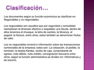 Este documento resume varios tipos de documentos comerciales, incluyendo pagarés, recibos de caja, cheques, facturas, remitos, notas de pedido y tarjetas kárdex. Explica que los documentos se clasifican como negociables o no negociables dependiendo de su función económica y provee detalles sobre el propósito y contenido de cada uno de estos documentos comerciales clave.