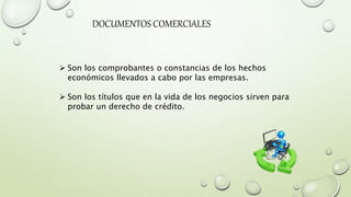 Este documento clasifica y describe los principales tipos de documentos comerciales, incluyendo cheques, letras de cambio, pagarés, facturas y recibos. Explica que los documentos comerciales son comprobantes de transacciones económicas realizadas por empresas y pueden ser negociables, como cheques y letras de cambio, o no negociables, como facturas y recibos. Define cada tipo de documento y su propósito.