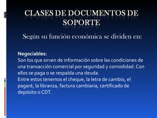 Los documentos comerciales son importantes para registrar las operaciones de una empresa de manera precisa. Existen documentos negociables como cheques y letras de cambio que sirven para pagar deudas, y documentos no negociables como notas y comprobantes que brindan datos para contabilidad. También existen documentos informativos como cotizaciones y pedidos que detallan transacciones sin fines de pago.