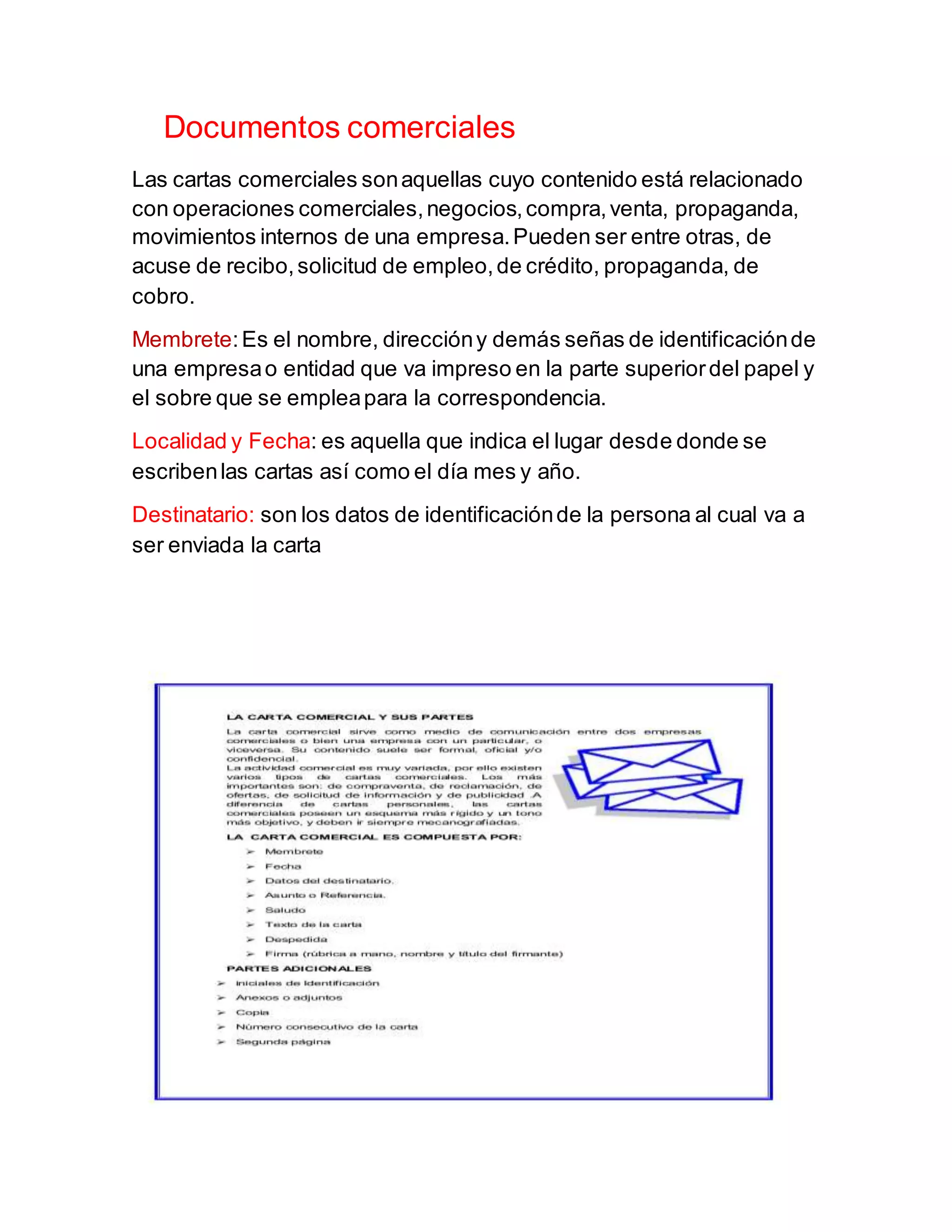 Las cartas comerciales, memorandos y facturas son documentos comerciales importantes. Las cartas comerciales se usan para operaciones de negocios como compras y ventas. Los memorandos se usan para comunicar información dentro de una organización. Las facturas contienen datos importantes como el período de facturación y la fecha de emisión.