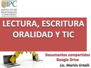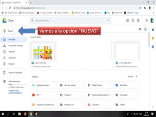 El documento explica los pasos para crear y compartir un nuevo documento en Google Drive. Primero se selecciona la opción "Nuevo" para crear un nuevo archivo o carpeta. Luego se le asigna un nombre al documento y se ingresan las direcciones de correo electrónico de las personas con quienes se desea compartir el archivo. Finalmente, se configura el acceso como "Puede editar" para permitir que los destinatarios editen directamente el documento compartido.