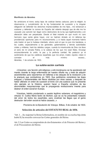 El documento presenta una recopilación de textos relacionados con la historia política de España en el siglo XIX, incluyendo el Manifiesto de Abrantes, la sublevación carlista, extractos del Estatuto Real de 1834, la Constitución de 1837, la desamortización de Mendizábal, el Convenio de Vergara y la Constitución de 1845. Los textos describen los conflictos políticos entre facciones absolutistas y liberales, las luchas por la sucesión al trono y los intentos de establecer una monar