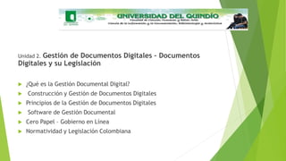 La gestión documental digital es un sistema que transforma documentos en papel en recursos valiosos a través de un proceso que incluye su creación, almacenamiento y utilización. Incluye el uso de software especializado y se apoya en políticas como la de 'cero papel', que busca mejorar la eficiencia y transparencia en la gestión documental. La normatividad colombiana establece regulaciones sobre este proceso, incluyendo la Ley General de Archivos y la Ley de Protección de Datos Personales.