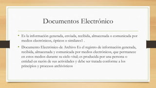 El documento describe los diferentes tipos de documentos electrónicos, incluyendo documentos ofimáticos, cartográficos, correos electrónicos, imágenes, video, audio y bases de datos. También discute las características de los documentos electrónicos como autenticidad, integridad y fiabilidad, así como el proceso de registro de documentos digitales y las ventajas e inconvenientes de los documentos físicos y electrónicos.