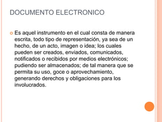 El documento describe los documentos electrónicos como aquellos que constan de manera escrita mediante representaciones, hechos, actos, imágenes o ideas creados, enviados o recibidos electrónicamente. Se clasifican en documentos públicos otorgados por funcionarios o documentos privados. Los documentos electrónicos son una especie de documentos informáticos como mensajes de datos, correos electrónicos, contratos electrónicos identificados por claves o firmas electrónicas. Desde una perspectiva jurídica, la validez y seguridad