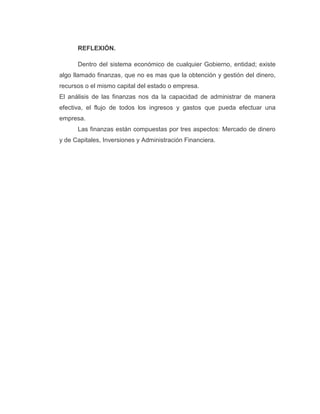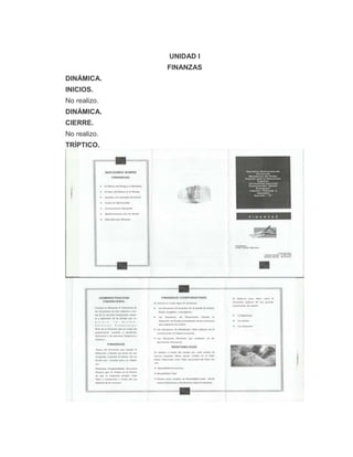 Este documento trata sobre el tema de las finanzas públicas y privadas. Se divide en ocho unidades que cubren temas como ingresos públicos, gastos públicos, impuestos, fuentes de financiamiento y equidad. Explica conceptos clave como presupuesto, política fiscal, tributos y tipos de gastos públicos. También compara las diferencias entre las finanzas públicas y privadas.