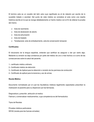 Este documento describe varios tipos de documentos médico-legales que los médicos utilizan en su práctica, incluyendo partes, oficios, certificaciones, actas, certificados y recetas médicas. Los documentos se clasifican como judiciales, sanitarios, administrativos o laborales y sirven para comunicarse con autoridades, dar constancia de hechos médicos o prescribir tratamientos. Algunos ejemplos específicos son el parte de lesiones, el certificado médico de defunción y las diferentes recetas para servicios de