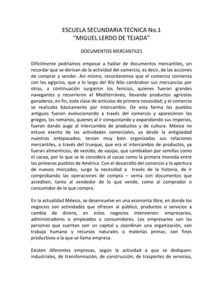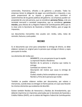 El documento aborda la evolución de los documentos mercantiles desde los inicios del comercio en civilizaciones antiguas hasta el contexto actual en México, donde se requiere documentación para cada transacción comercial. Se describen diversos tipos de documentos mercantiles, como recibos, vales, notas de remisión, facturas y cartas poder, cada uno con sus elementos esenciales y funciones específicas. Además, se explica la importancia del registro federal de contribuyentes y las obligaciones fiscales de las empresas en la economía moderna.