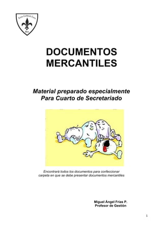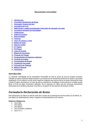 Este documento proporciona una lista de 24 documentos mercantiles comúnmente utilizados en las operaciones comerciales, como declaraciones de impuestos, facturas, cheques, contratos laborales, entre otros. Explica brevemente cada uno de estos documentos y los requisitos para su correcta emisión y presentación. El objetivo es servir de guía para las empresas sobre los principales documentos requeridos en sus transacciones comerciales y cumplimiento tributario.