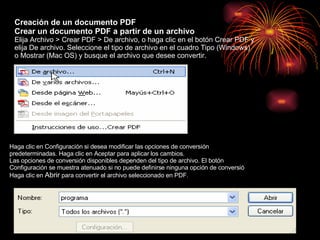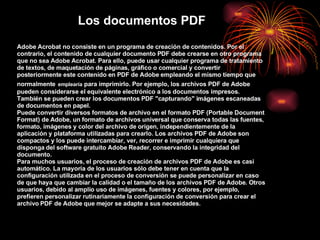 Los documentos PDF de Adobe no son programas de creación de contenido, sino que sirven para almacenar y compartir contenido creado en otros programas. El contenido se puede crear en cualquier programa y convertir al formato PDF, que permite intercambiar, ver e imprimir documentos de forma independiente del software o dispositivo utilizado. Los archivos PDF mantienen la integridad del documento original al conservar fuentes, formato, imágenes y color.