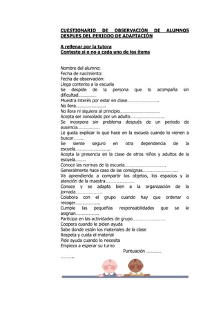Este documento presenta cuestionarios de observación de alumnos después de un período de adaptación. El primer cuestionario contiene ítems sobre el comportamiento del alumno en la escuela, como si llega contento, acepta ser consolado, respeta las normas, y participa en actividades grupales. El segundo documento es una entrevista inicial con los padres sobre el desarrollo del alumno, incluyendo detalles sobre el embarazo, habilidades motoras, alimentación, sueño, y relaciones familiares.
