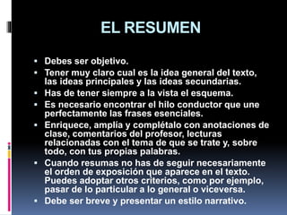 Este documento proporciona información sobre cómo elaborar resúmenes, informes y ensayos de documentos técnicos y científicos. Explica que un resumen debe ser breve, objetivo y presentar las ideas principales y secundarias de manera coherente. También describe las características y etapas de elaboración de informes, los cuales comunican información dirigida para la toma de decisiones. Por último, detalla el proceso para elaborar ensayos, el cual implica planear, preparar y componer el argumento principal y la e