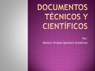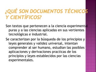 Este documento describe diferentes tipos de textos técnicos y científicos, así como los documentos más útiles para resumir información, que son el resumen, el informe y el ensayo. Explica que el resumen es una representación abreviada y precisa del contenido de un documento, mientras que el informe proporciona recomendaciones y conclusiones motivacionales. El ensayo consiste en la interpretación libre de un tema sin necesidad de citas.