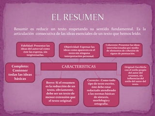 El documento define un resumen como una reducción de un texto que mantiene su sentido fundamental. Explica que un resumen debe ser fiel, objetivo, coherente, completo, breve y correcto. Además, detalla los pasos para realizar un resumen: realizar una lectura comprensiva, descubrir la estructura semántica, omitir información complementaria y expresar las ideas principales con lenguaje informativo.