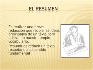 Este documento ofrece una descripción general de los diferentes tipos de resúmenes y ensayos. Explica que un resumen debe capturar las ideas principales de un texto de manera concisa y objetiva, mientras que un ensayo presenta el análisis y la interpretación personal del autor sobre un tema. También define las características estructurales y de estilo de ambos géneros y ofrece ejemplos de cada uno.