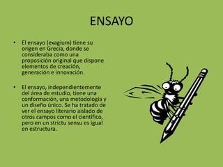 Este documento proporciona información sobre diferentes tipos de documentos técnicos y científicos como ensayos, informes y resúmenes. Explica que el ensayo tiene su origen en Grecia y se caracteriza por presentar ideas originales de manera creativa e innovadora. También describe los componentes clave de un ensayo como el campo de acción, marco teórico y tesis. Del mismo modo, explica las características y estructura de un informe técnico y las etapas para elaborar un resumen conciso.