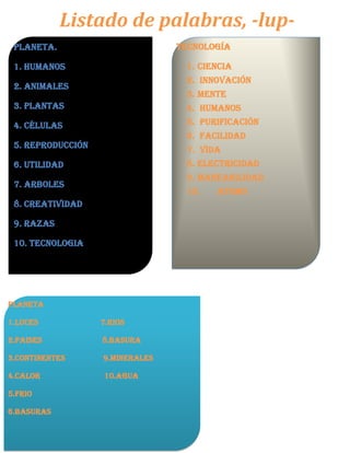 El documento presenta dos listas de palabras clave relacionadas con la tecnología y el planeta. La primera lista contiene 10 palabras como ciencia, humanos, innovación e ideas relacionadas con la tecnología. La segunda lista enumera 10 características del planeta como continentes, agua, calor y basura.