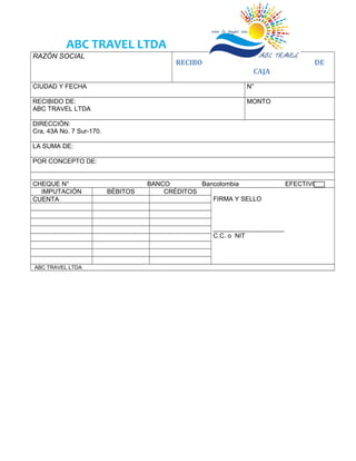Este documento contiene 3 páginas relacionadas con las operaciones de una agencia de viajes llamada ABC Travel Ltda. La primera página es una factura de venta que detalla un cliente, fecha, descripción y valor de productos. La segunda página es un recibo de caja que especifica un monto recibido de ABC Travel. La tercera página contiene formatos para cheques con detalles como número de cuenta, beneficiario y saldos.