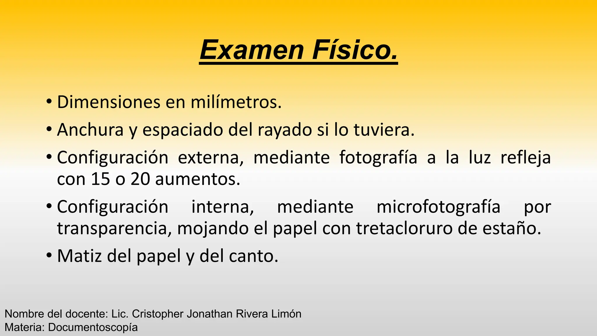 Este documento describe varias técnicas utilizadas en documentoscopía para examinar documentos sin alterarlos, incluyendo exámenes ópticos con microscopio, iluminación con luz ultravioleta, infrarroja y polarizada, métodos de calco y tratamiento con resina, y el uso de microscopio electrónico de barrido. El objetivo es analizar aspectos físicos del papel y características de la tinta sin dañar el documento.