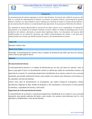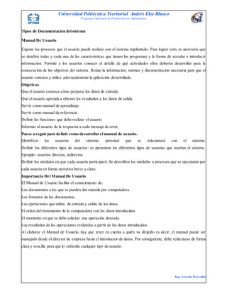 El documento describe la importancia de la documentación de sistemas y diferentes tipos de documentación, incluyendo manuales de usuario e informes finales. Explica que la documentación de sistemas proporciona información sobre qué hacen los sistemas, cómo funcionan y para quién, y es esencial para el mantenimiento, auditoría y uso del sistema. También cubre el proceso de desarrollo de manuales de usuario, incluyendo la identificación de usuarios y módulos, y la capacitación de usuarios.