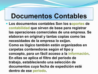 El documento describe varios tipos de documentos contables y comerciales importantes para llevar un control financiero adecuado en una empresa, incluyendo facturas, notas de débito y crédito, letras de cambio, cheques, recibos de pago, comprobantes de ingresos y egresos, y otros documentos utilizados en transacciones bancarias. Explica que estos documentos sirven como soporte para registrar operaciones y proporcionar veracidad a la información financiera de una compañía.