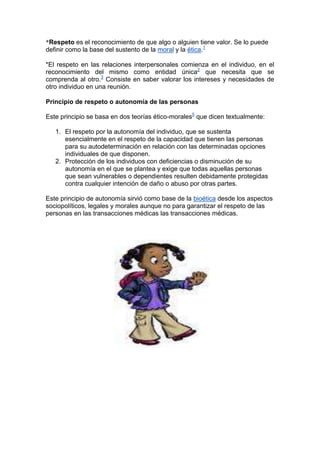 El documento habla sobre el respeto. Define el respeto como el reconocimiento de la existencia y valor de los demás. Explica que el respeto hacia uno mismo y los demás es fundamental para las relaciones interpersonales y la armonía social. También describe el respeto como un principio ético que protege la autonomía individual y previene el abuso de los más vulnerables.