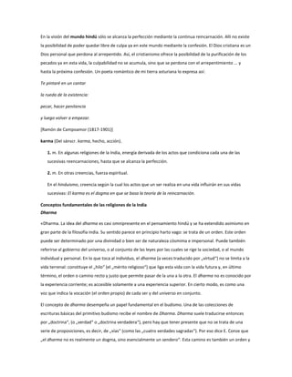 El documento describe las creencias hindúes del karma y el dharma. Explica que el karma se refiere a las acciones de una persona y cómo estas afectan su destino en vidas futuras a través de la reencarnación. El dharma se refiere al orden moral y las leyes que rigen el universo y determinan el camino de cada ser.
