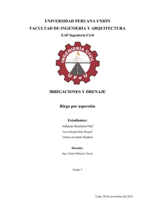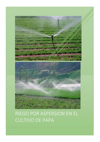 Este documento describe los fundamentos teóricos y el diseño de un sistema de riego por aspersión para el cultivo de papa. Explica que el riego por aspersión consiste en aplicar agua en forma de lluvia usando bombas, tuberías, aspersores y otros componentes. También presenta la clasificación de sistemas de aspersión, las características de este método en comparación con otros como goteo y microaspersión, y los pasos para diseñar e implementar correctamente un sistema de riego por aspersión.