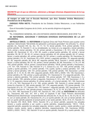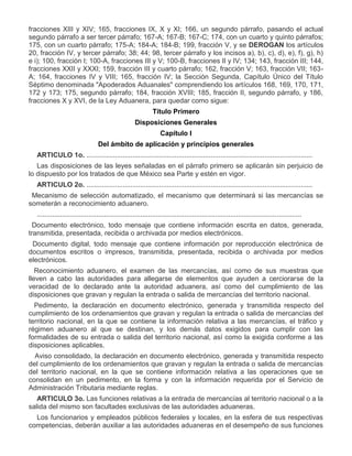 Este documento reforma, adiciona y deroga diversas disposiciones de la Ley Aduanera de México. Entre los cambios principales se encuentran la adición de definiciones como "documento electrónico" y "pedimento", la reforma de artículos para facilitar el uso de tecnologías electrónicas en trámites aduaneros, y la adición de un capítulo sobre notificaciones electrónicas. El objetivo general es modernizar la ley para adaptarla al comercio exterior digital.