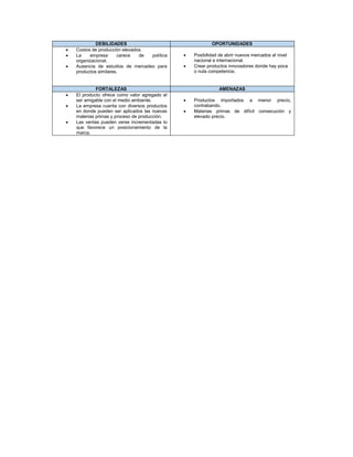 El documento analiza las debilidades, oportunidades, fortalezas y amenazas de una empresa. Presenta como debilidades los altos costos de producción, falta de política organizacional y ausencia de estudios de mercado. Como oportunidades menciona la posibilidad de abrir nuevos mercados nacionales e internacionales y crear productos innovadores. Entre las fortalezas señala que sus productos son amigables con el medio ambiente y que cuenta con diversos productos donde aplicar nuevas materias primas. Finalmente, identifica como amenazas los productos