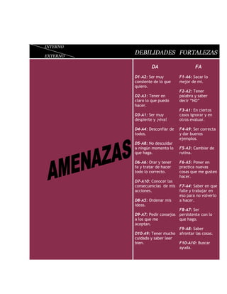 Este documento presenta una matriz DOFA que analiza las debilidades, oportunidades, fortalezas y amenazas de una persona. La matriz identifica 10 debilidades internas como el orgullo, la impaciencia y la sensibilidad. También identifica 10 fortalezas internas como la honestidad, el respeto y la alegría. Externa mente, la matriz destaca 10 oportunidades como el cambio, la profesión y la colaboración, así como 10 amenazas como los nervios, la crítica y la economía. Finalmente, la matriz relaciona estas