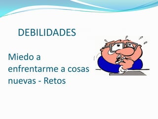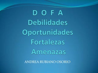 Andrea Rubiano Osorio realizó un análisis de sus debilidades, oportunidades, fortalezas y amenazas. Sus debilidades incluyen el miedo a enfrentar cosas nuevas y retos. Sus oportunidades son crecer como persona para tener un futuro mejor para ella y sus hijos. Sus fortalezas son su entusiasmo y ganas de salir adelante por sus hijos y familia. Sus amenazas son el miedo a la familia, la sociedad, las limitaciones, el fracaso y pensar "no puedo".
