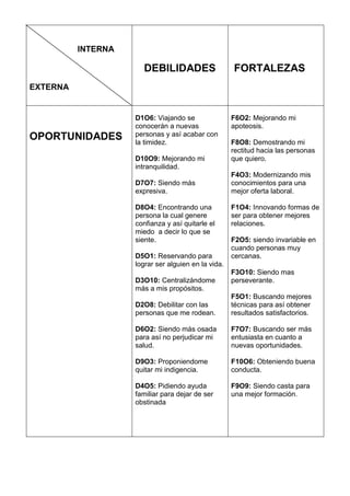 Este documento presenta una lista de debilidades internas, fortalezas internas, oportunidades externas y amenazas externas de una persona. Las debilidades incluyen ser tímida, penosa, distraída, terca, gastadora y malgeniada. Las fortalezas son ser creativa, constante, persistente, innovadora, recursiva, entusiasta, dinámica, leal, honesta y con ética. Las oportunidades son estudiar, salud, trabajar, amar, tener familia, viajar, participar, buenas amistades, capacitar