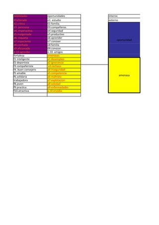 Este documento presenta una lista de debilidades y fortalezas internas de una persona, así como oportunidades y amenazas externas. La persona tiene debilidades como ser demasiado crítica, perezosa e impulsiva, pero también fortalezas como ser inteligente, deportista y buen consejero. Las oportunidades externas incluyen la educación, la familia y nuevas experiencias, mientras que las amenazas son el desempleo, la ignorancia y la competencia.